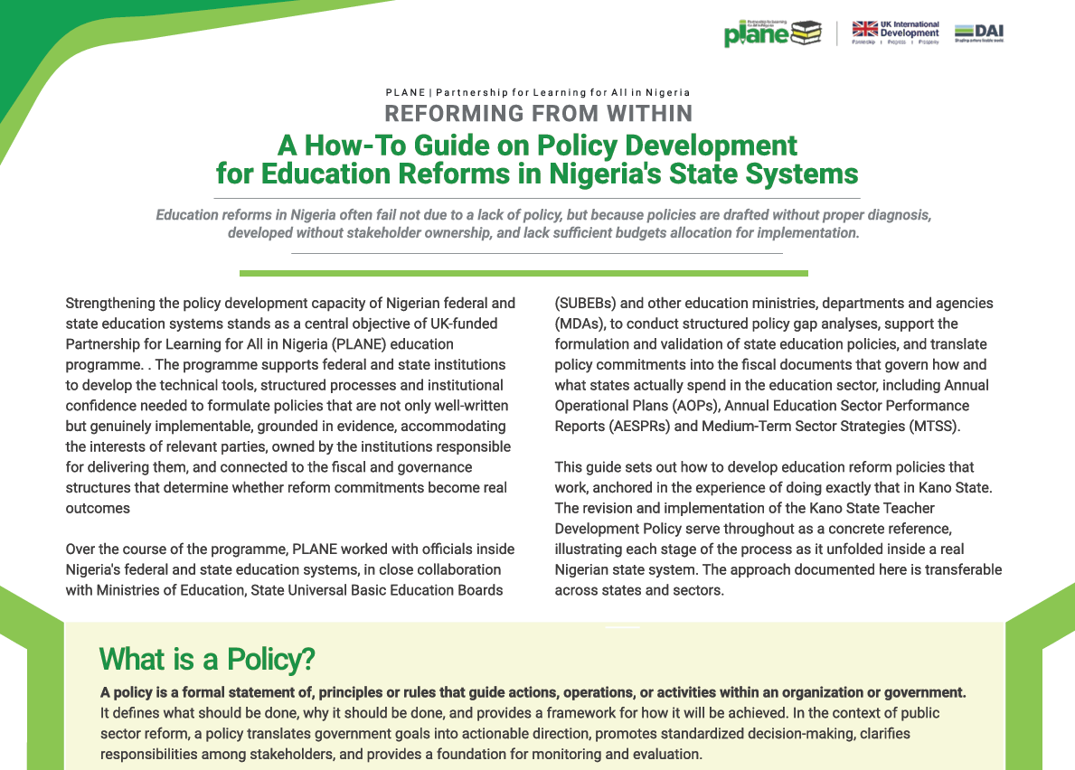 Download to learn more about this report: https://planenigeria.com/wp-content/uploads/2026/04/A-How-To-Guide-on-Policy-Development-for-Education-Reform-in-Nigerias-State-Systems-V1.pdf